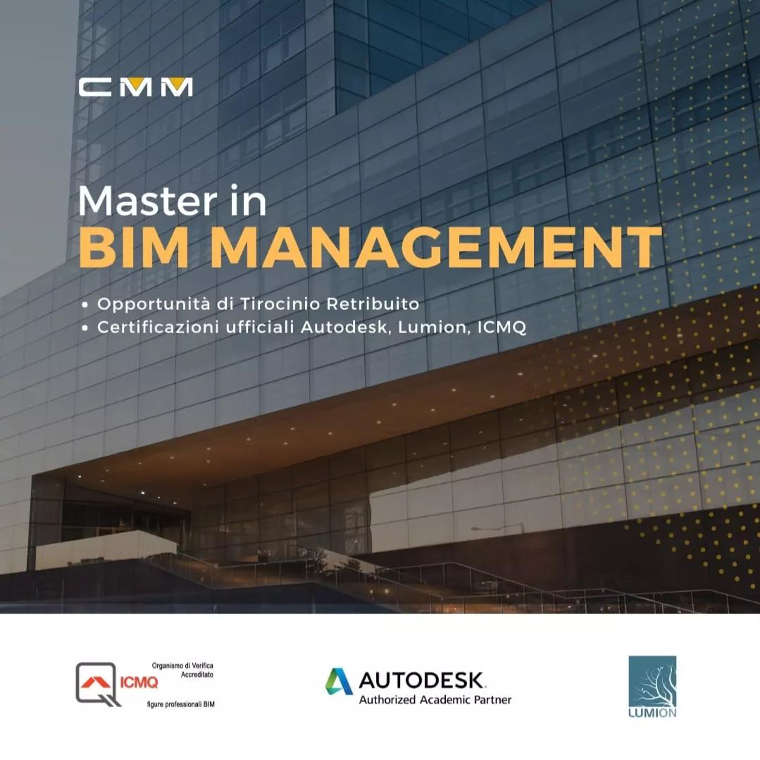 Il MASTER in BIM MANAGEMENT, Specialistico non-universitario, in collaborazione con la BIMACADEMY di Milano, Organismo di Verifica ICMQ (per la certificazione delle competenze in ambito BIM), prepara i Professionisti, per renderli pronti alla transizione al Building Information Modeling.